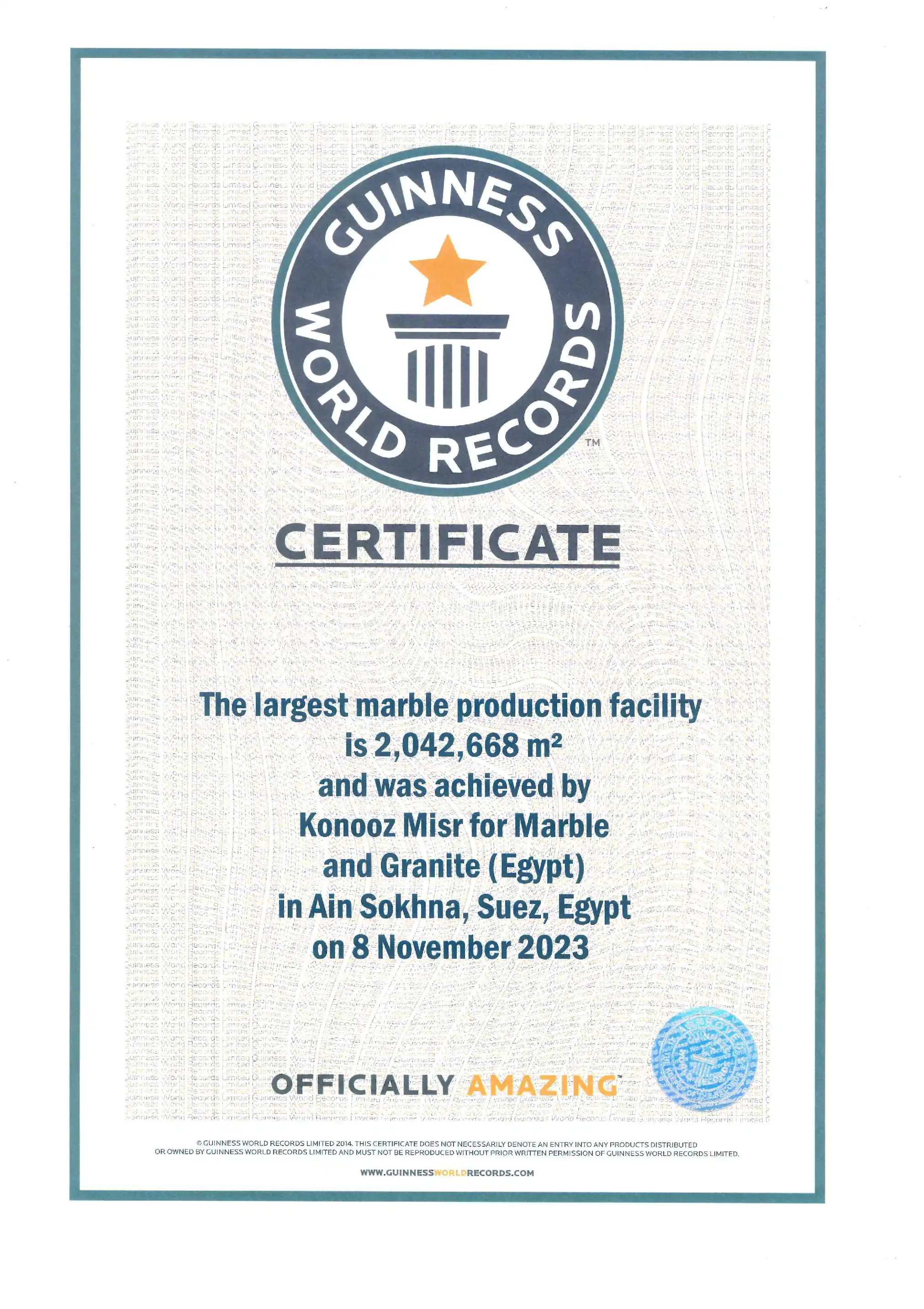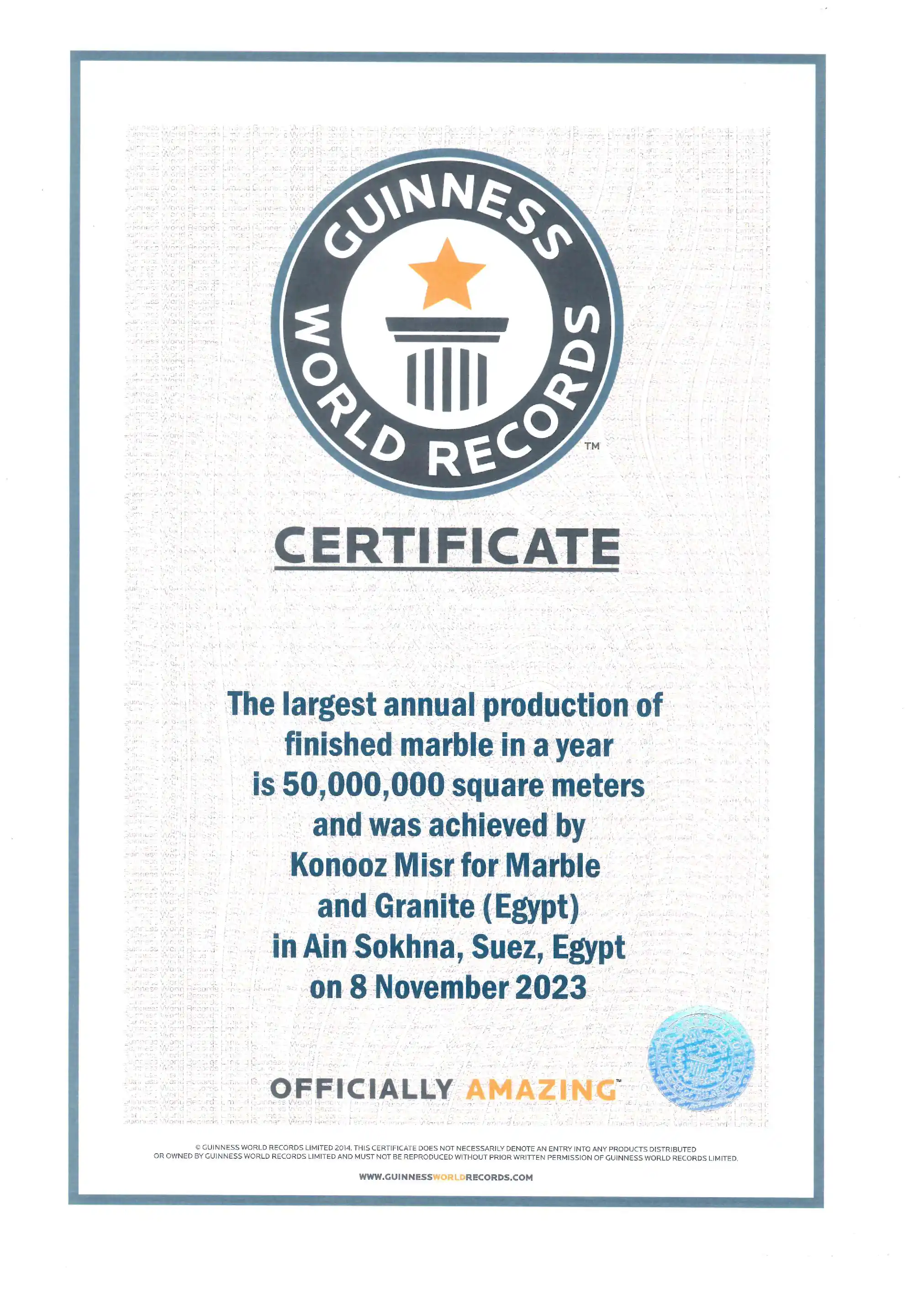 Largest Annual Production of Finished Marble: Setting a new world benchmark with an unprecedented annual output of 50,000,000 square meters.Location: Ain Sokhna, Suez, Egypt. Achievement Date: November 8, 2023.